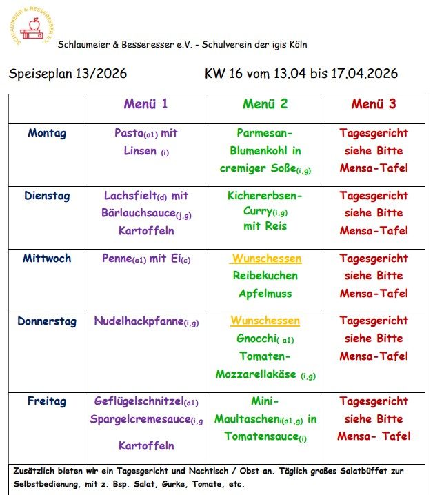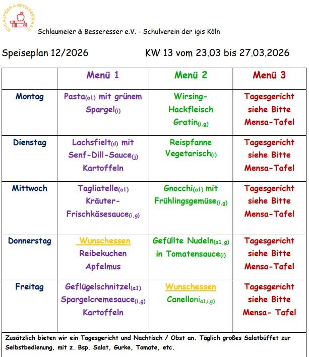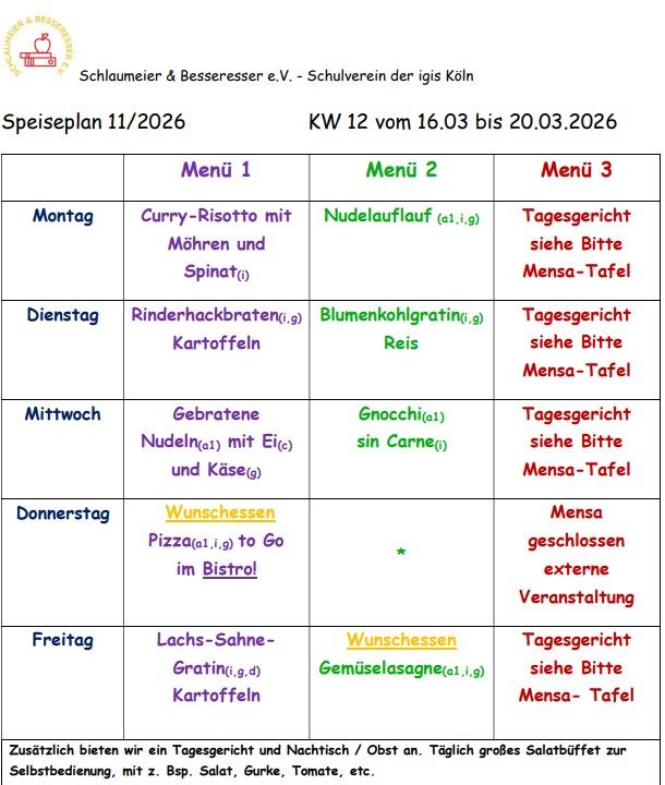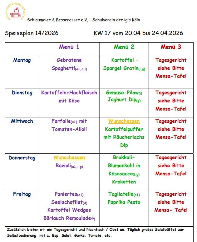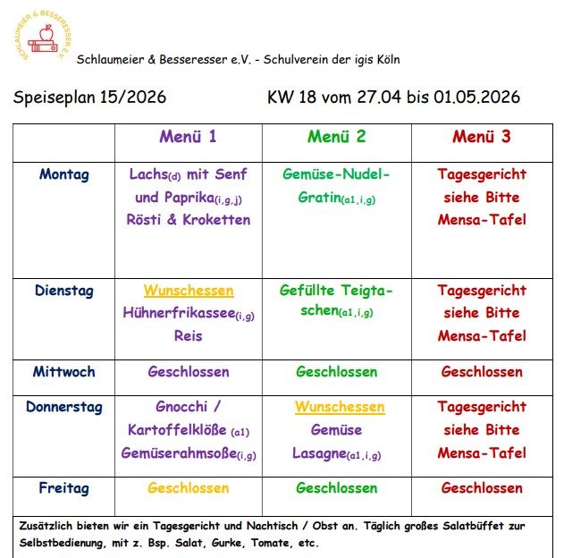 Unter www.sundb@igis-koeln.de finden Sie auch die Preise für das Mensa- und Bistroangebot. Hier ist ebenfalls der aktuelle Speiseplan für die Mensa zu finden. Wir bieten täglich zwei verschiedene Gerichte an, dazu ein frisches Salatbuffet, die ausgewogen und abwechslungsreich sind und die Sie vorab mit Ihrem Kind einsehen können. Zusätzlich gibt es ein Tagesgericht, welches tagesaktuell auf der Tafel am Mensaeingang aushängt.